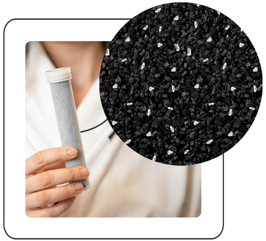 Der MILO-Filter verstärkt die Reduzierung von Schwermetallen im Wasser, indem er diese an der Oberfläche adsorbiert. Diese Funktion wird durch die Aktivkohle im Filter ermöglicht, die eine poröse Struktur besitzt. Der Adsorptionsprozess ermöglicht eine deutliche Reduzierung von Schwermetallen.